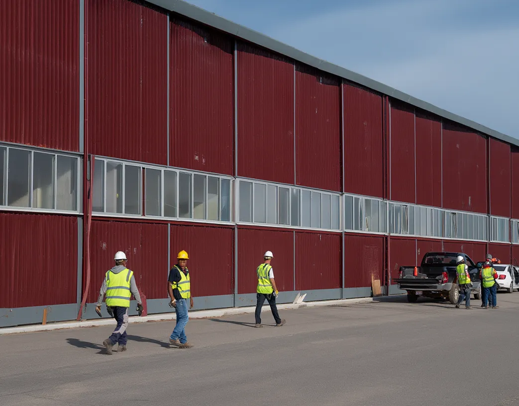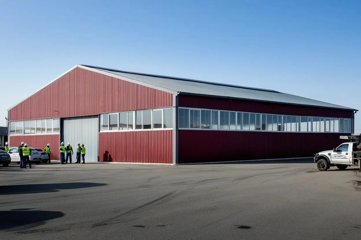 - Установка ограждающих конструкций: монтаж сэндвич‑панелей, кровли и окон.